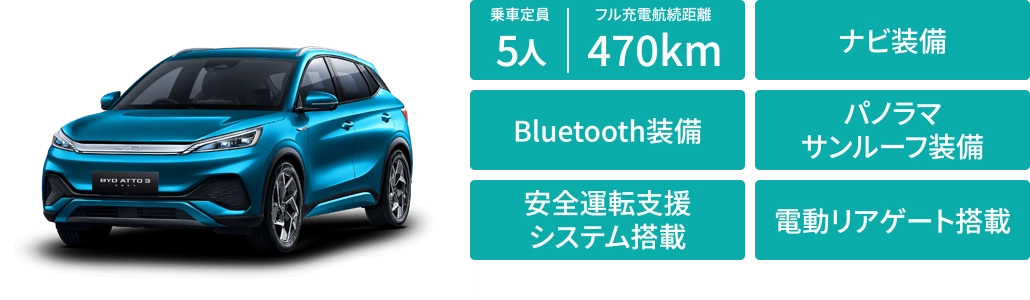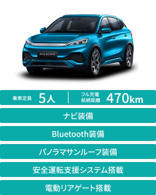 世界販売台数No,1の電気自動車ブランド「BYD」の人気車種をラインナップ。 BYDは、1995年に中国・深圳で創業し、ITエレクトロニクス、自動車、新エネルギー、都市モビリティの4つの領域で事業をグローバルに展開しています。
